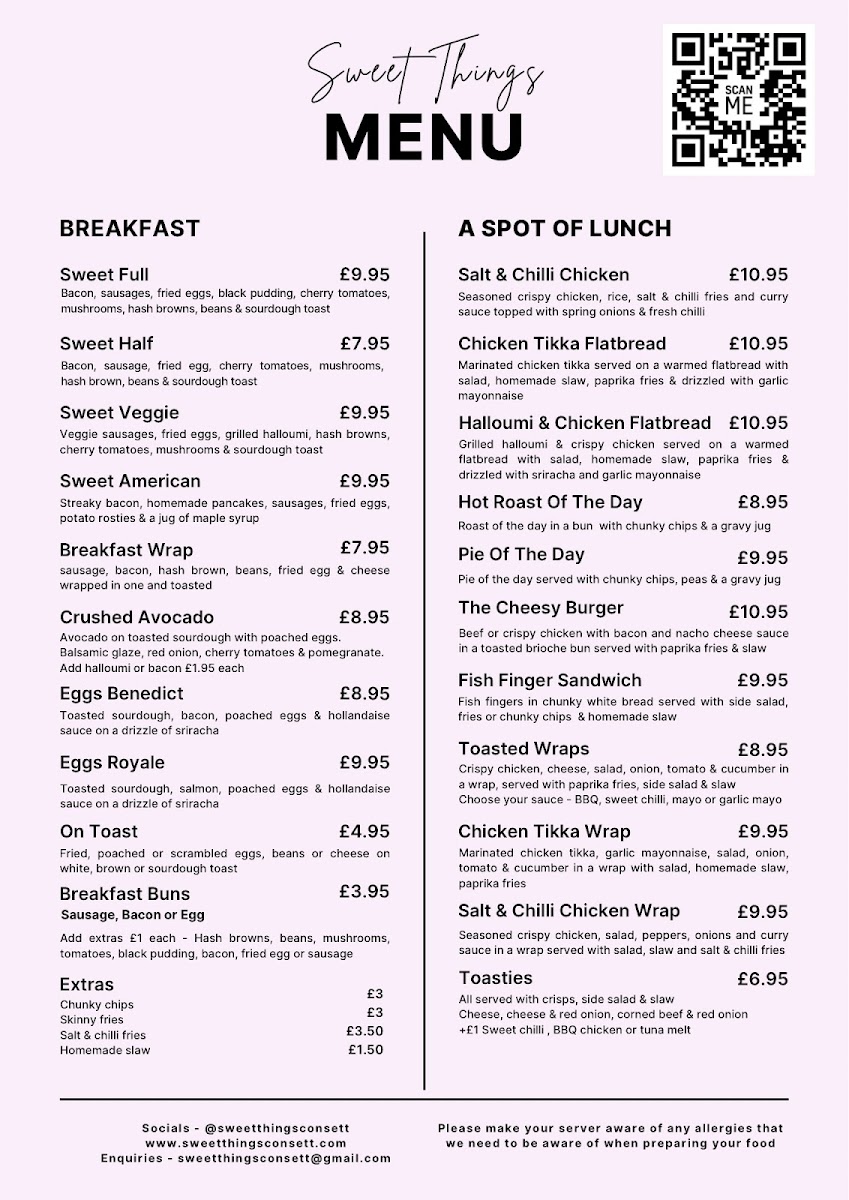 Welcome to Sweet Things Cafe, your new favorite spot located at 4 Regents Ct, Consett. This café boasts a delightful menu that caters to all tastes, perfect for breakfast or lunch enthusiasts. Start your day with the Sweet Full Breakfast (£9.95) or enjoy a lighter Sweet Half (£7.95), featuring fresh ingredients crafted with care.